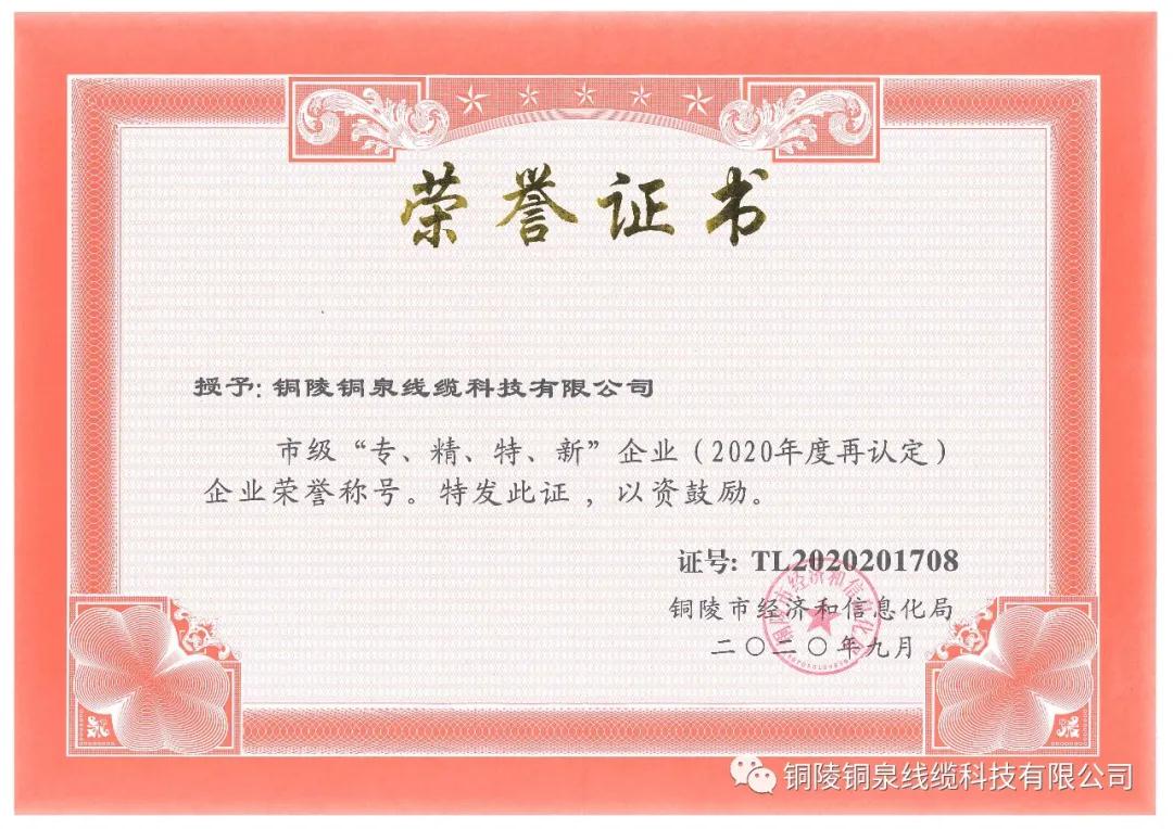 經(jīng)過層層評比,近日,銅泉公司通過了2017年度市級專精特新企業(yè)復(fù)核認定!此次的復(fù)核通過再次證明了銅泉線纜在市場、質(zhì)量、效益、發(fā)展等方面的先進性和示范性,更是對我公司在“專業(yè)化、精細化、特色化、創(chuàng)新化”等方面所做努力的高度肯定。